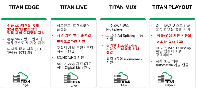 HEVC, MPEG-4 AVC, MPEG-2 인코딩 등 멀티코덱을 지원하며 출력 형식은 UHD 4K, HD, SD, ABR 멀티스크린 IP Video 전송을 위한 멀티 비트레이트(MBR) 트랜스코딩 등입니다.